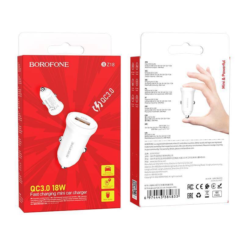 Автомобильное зарядное устройство АЗУ USB BOROFONE BZ18 power single port QC3.0 (белый)