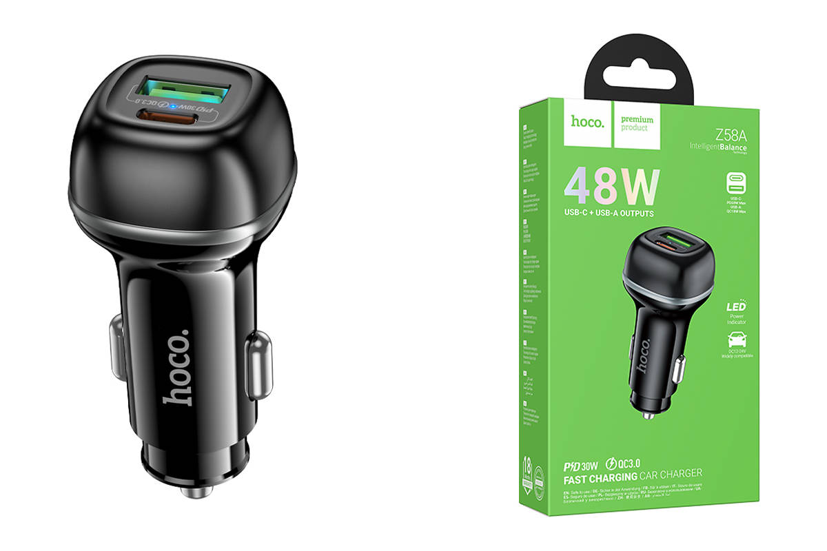Автомобильное зарядное устройство АЗУ USB + USB-C HOCO Z58A Rank 48W dual port PD30W+QC3.0 (черный)