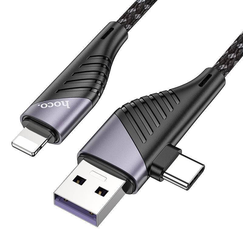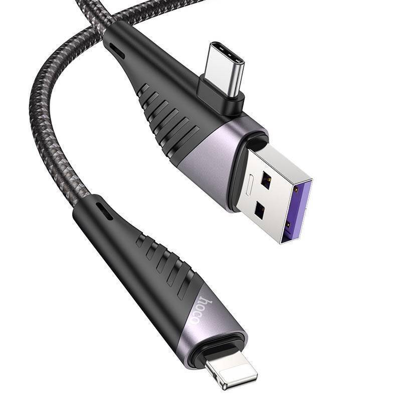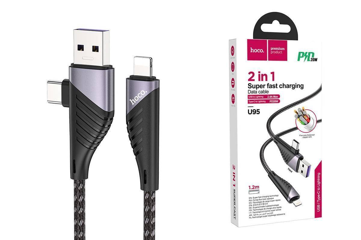 Кабель USB 2 в 1 HOCO U95 (USB/Type-C to Lightning) 3A (черный) PD20W 1,2м (в оплетке, с усилением)