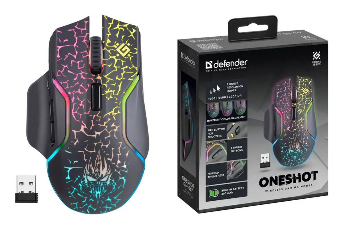Мышь игровая беспроводная Defender Oneshot GM-067 черный 3200 dpi/ радужн.подсветка/встроенный аккумул.