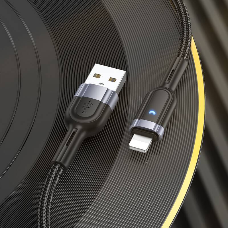 Кабель USB - Lightning HOCO S24, 2,4A (черный) 1,2м (LED индикатор, в оплетке)