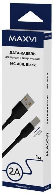 Кабель USB - MicroUSB Maxvi (MC-A01L) 2A (черный) 1м (УДЛИНЕННЫЙ ШТЕКЕР)