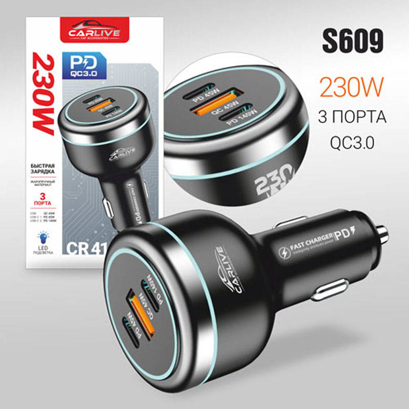 Автомобильное зарядное устройство Carlive CR41 QC45W + PD45W + PD140W 230W (Black) в упаковке 5pcs 20217672