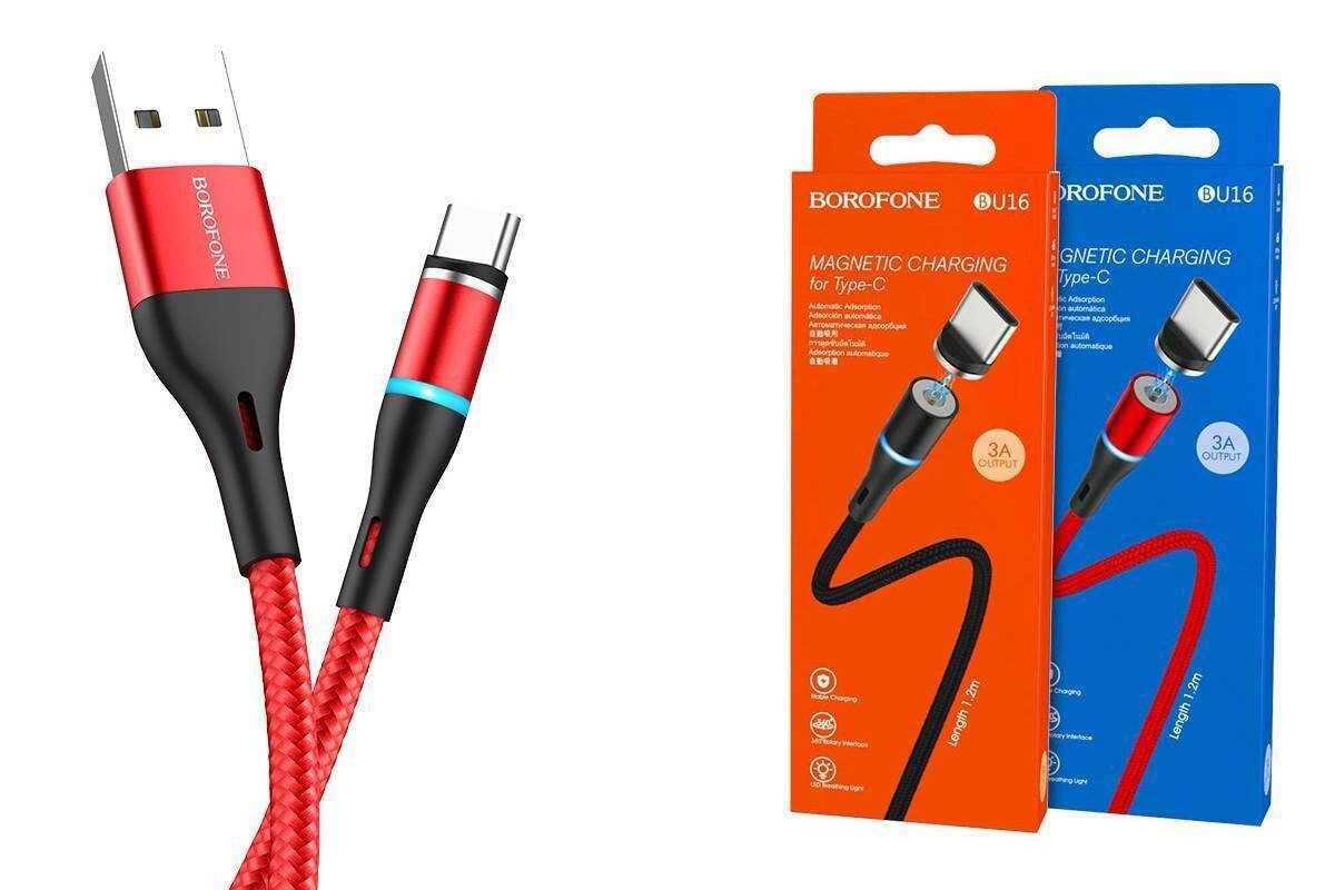 Кабель USB - USB Type-C BOROFONE BU16, 3A (красный) 1,2м (в оплетке, магнитный, LED индикатор)