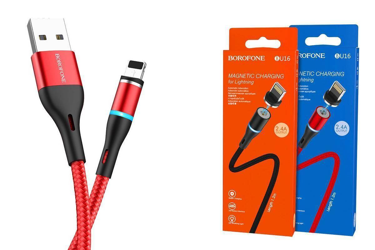 Кабель USB - Lightning BOROFONE BU16, 2,4A (красный) 1,2м (магнитный, в оплетке, LED индикатор)