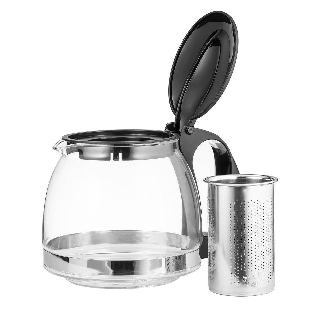 При изготовлении были использованы только экологически чистые материалы. Чайник классической формы выполнен из прозрачного силикатного стекла, стильная крышка и ручка – из пищевого пластика. Кольцо из нержавеющей стали с хромированной отделкой крепит ручку к колбе и дополняет внешний вид. Жесткий фильтр для заваривания из нержавеющей стали легко снимать и чистить.