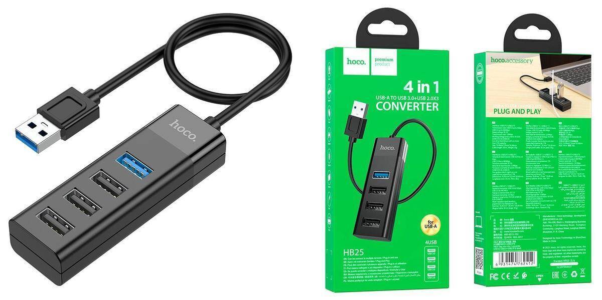 Разветвитель USB HUB 3.0 HOCO HB25 на 4 порта 1xUSB3.0 + 3xUSB2.0 (Black)