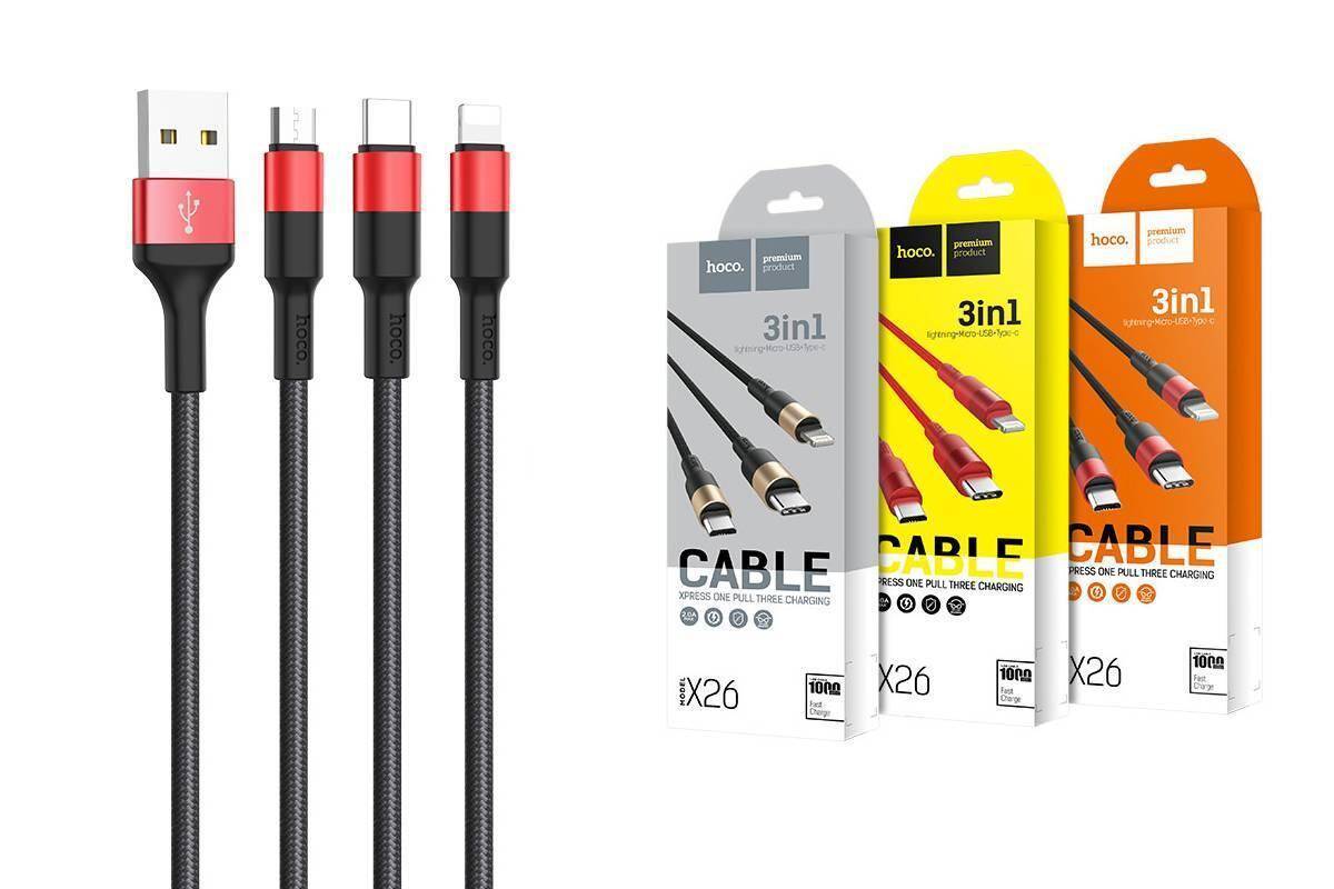 Кабель USB 3 в 1 HOCO X26 lightning/Micro/Type-c (черно-красный) 1м