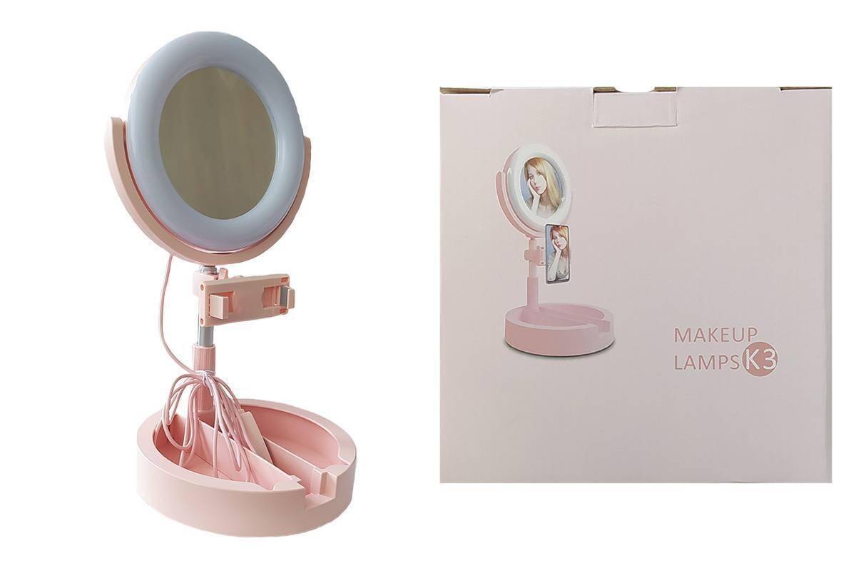 Кольцевая лампа настольная К-3 (16 см) для фото и видеосъемки с креплением телефона и зеркалом (розовый) 20048510