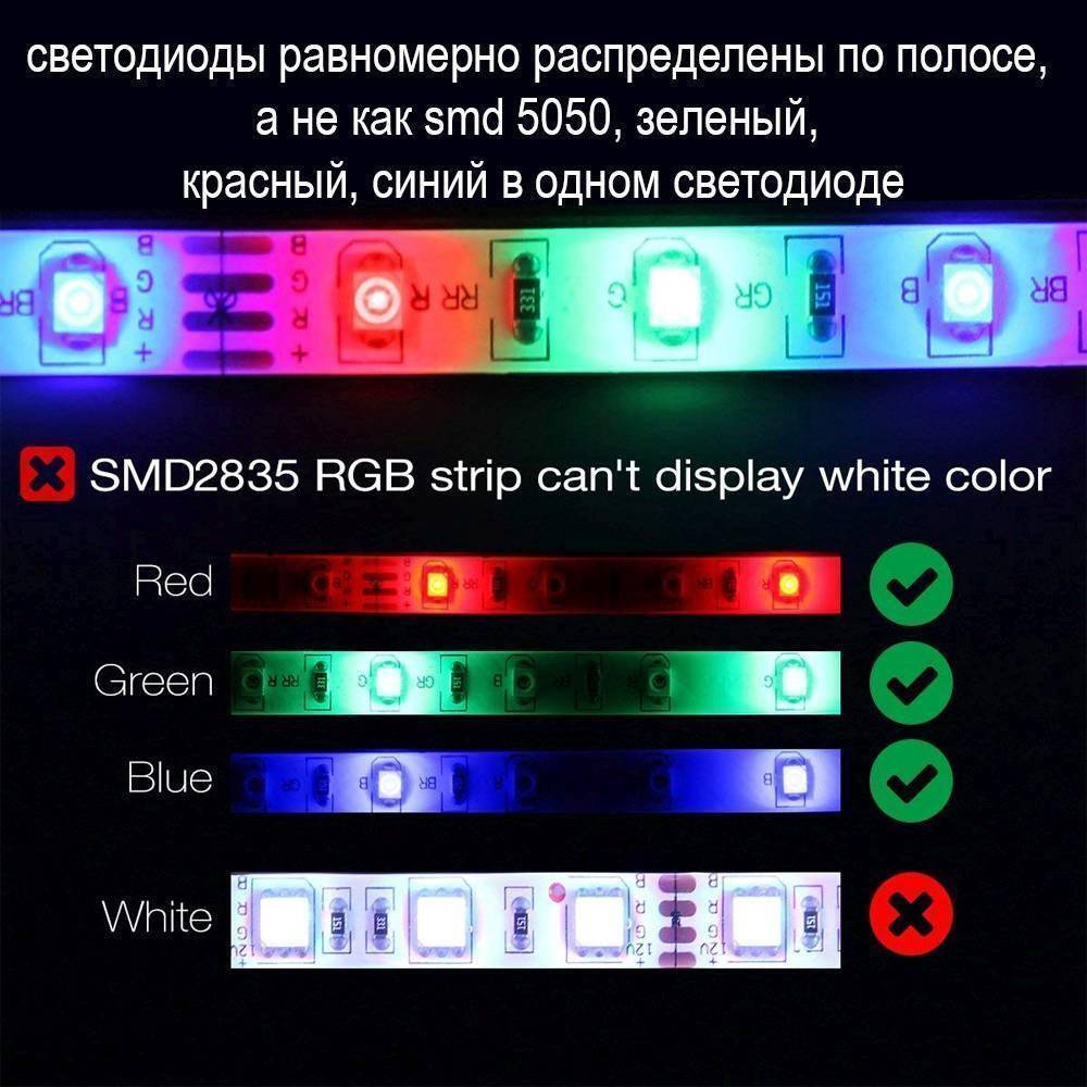 1) лента SMD 2835 (светодиоды расположены друг за другом красный/зеленый/синий не RGB светодиоды) длиной 5 метров,