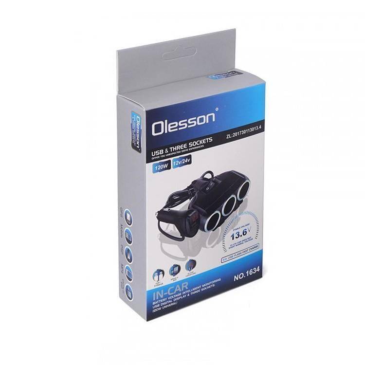 Разветвитель прикуривателя в авто OLESSON 1634 (3 гнезда+USB) 20051619