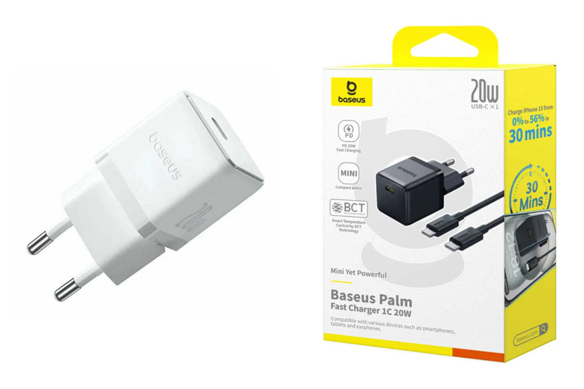 Сетевое зарядное устройство USB-C+ кабель Type-C - Type-C BASEUS Palm Fast Charger 1C 20W With Baseus Mini Moon White 20217338
