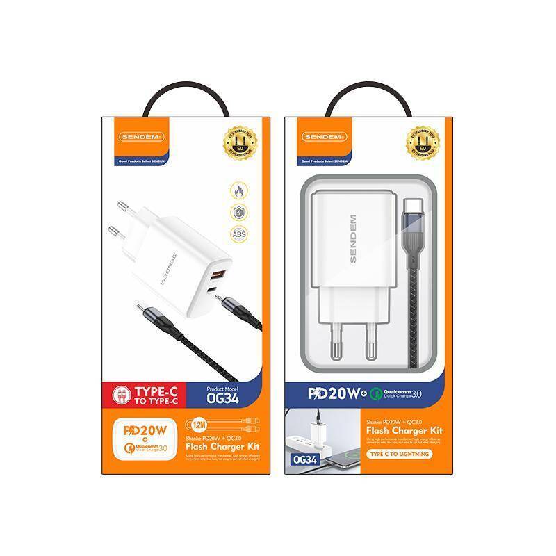 Сетевое зарядное устройство USB + USB-C + кабель Type-C SENDEM OG34 (бело-черный) 20086095