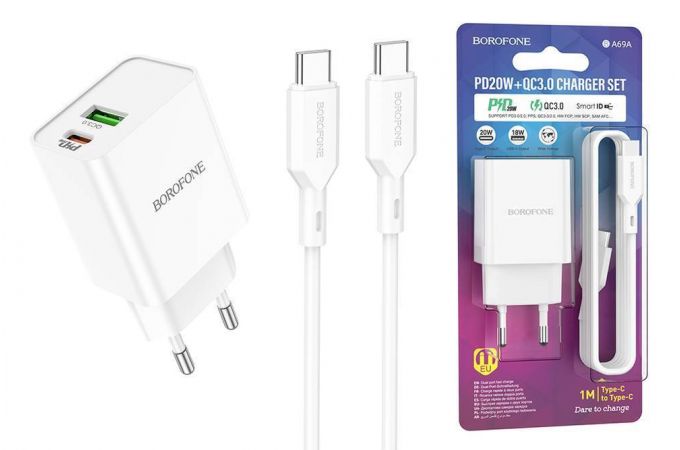 Сетевое зарядное устройство USB+USB-C + кабель Type-C-Type-C BOROFONE BA69A Powerful PD20W + QC3.0 (белый) 20137613