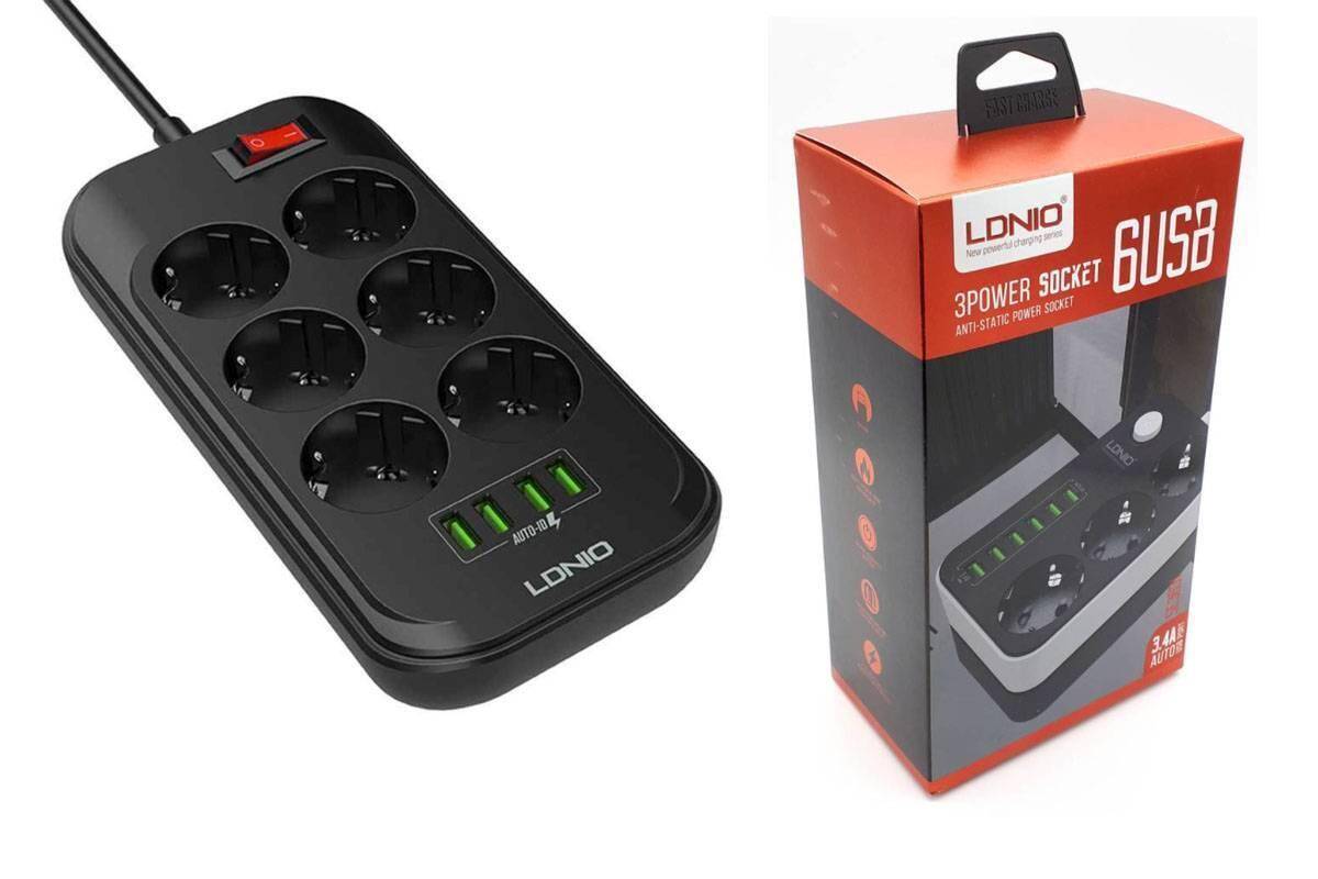 Сетевой фильтр LDNIO SE6403 (2м, 6 розеток (медь) + ЗУ, 4 USB, черно-серый) 20036800
