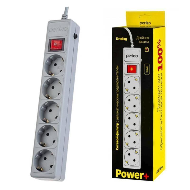 Сетевой фильтр Perfeo "POWER+", 1,8м, 5 розеток, серый (PF-PP-5/1,8-G) 20062125