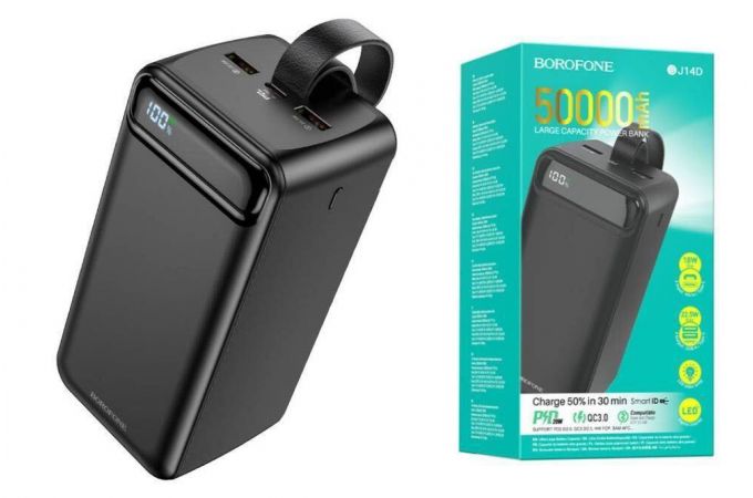 Внешний аккумулятор 50000 mAh на 2 USB и USB-C Borofone BJ14D обладает быстрой зарядкой, Led-дисплеем, фонариком и ремешком – зарядное устройство с универсальными интерфейсами.