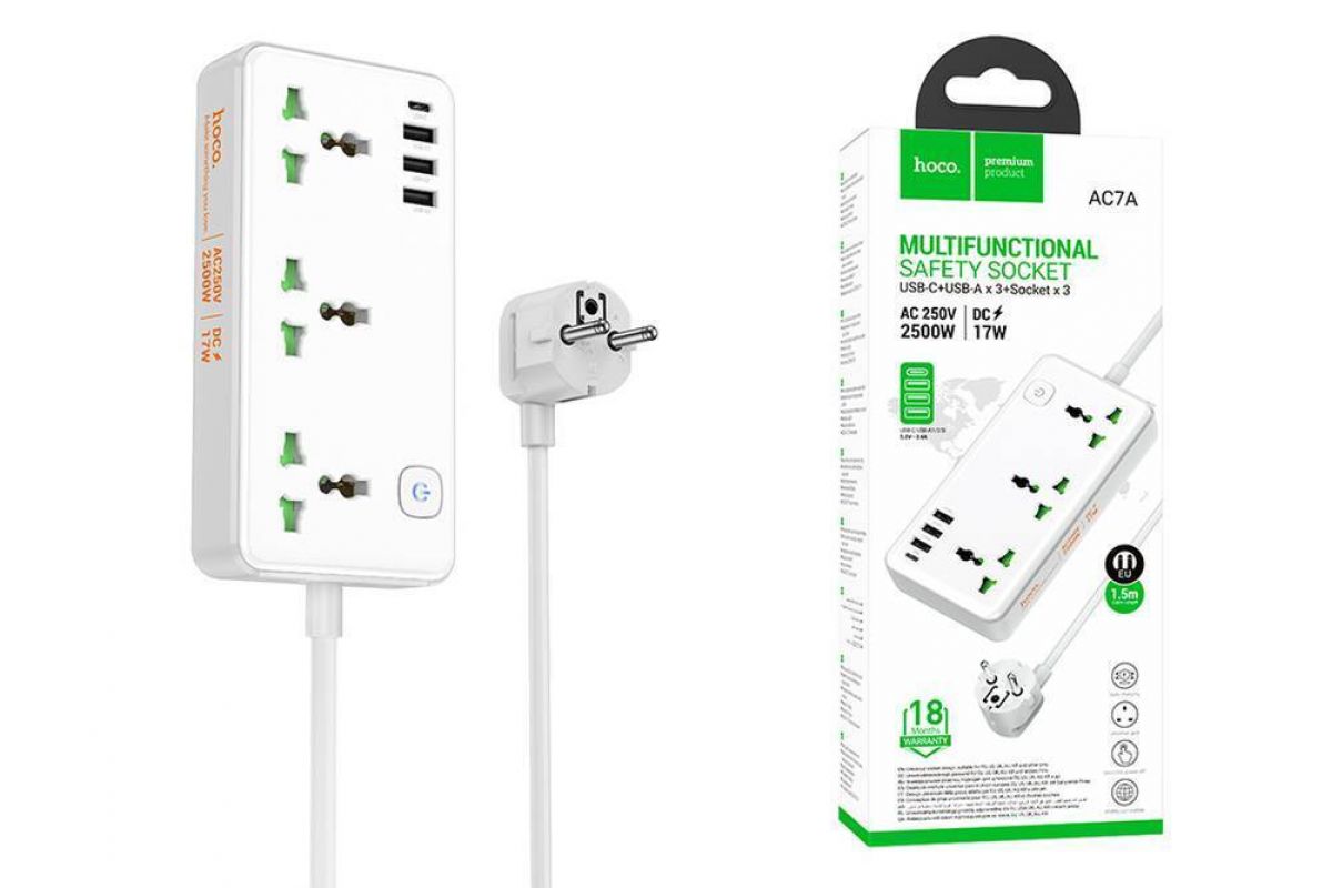 Сетевой фильтр HOCO AC7A Storm (2м, 3 розетки, 3 USB + USB-C (белый)