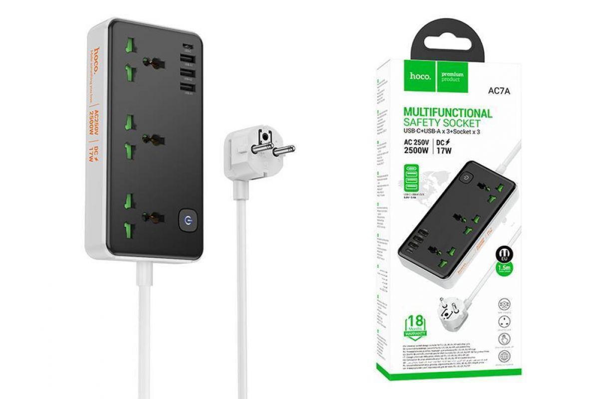Сетевой фильтр HOCO AC7A Storm (2м, 3 розетки, 3 USB + USB-C (черный)