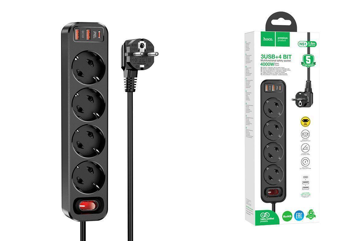 Сетевой фильтр HOCO NS1 (1,8 м, 4 розетки + 2 USB-A+ USB-C ) PD 20W Fast Charger (черный)