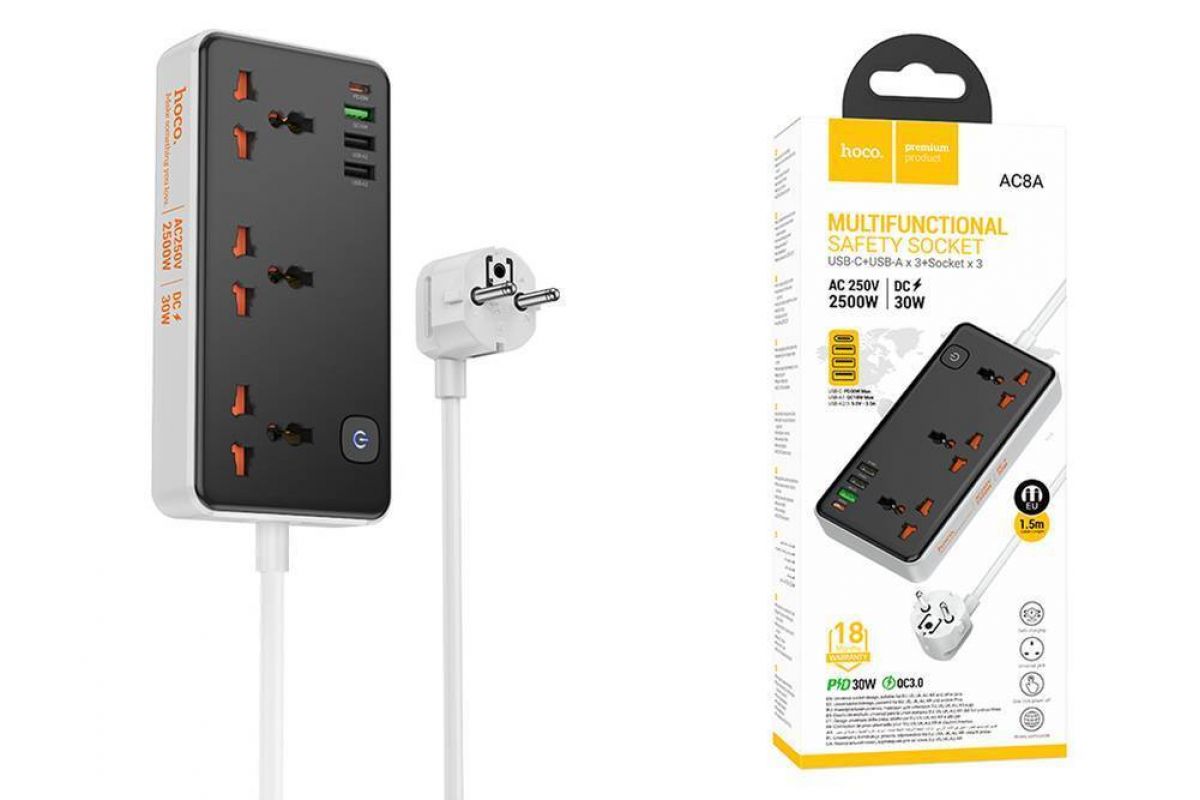 Сетевой фильтр HOCO AC8A Storm (2м, 3 розетки, 3 USB + USB-C PD30W Fast Charger (черный)