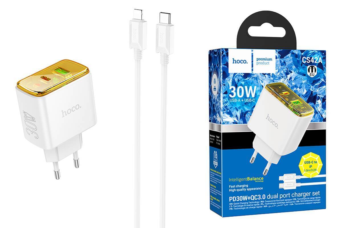 Сетевое зарядное устройство USB + USB-C + кабель Lightning - Type-C HOCO CS42A Smart PD30W + QC3.0 (белый)