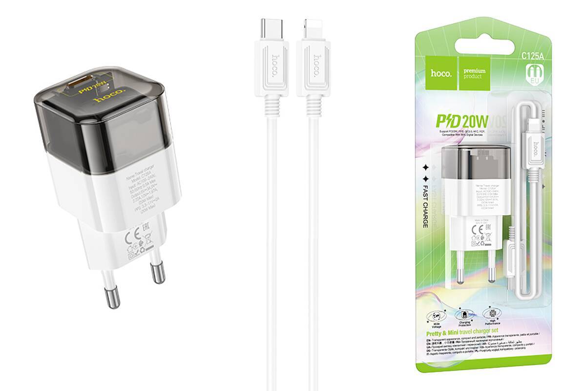 Сетевое зарядное устройство USB-С + кабель Lightning HOCO C125A PD20W (черный прозрачный)