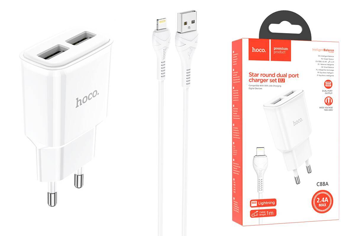 Сетевое зарядное устройство 2USB + кабель Lightning HOCO C88A 2400mAh (белый)