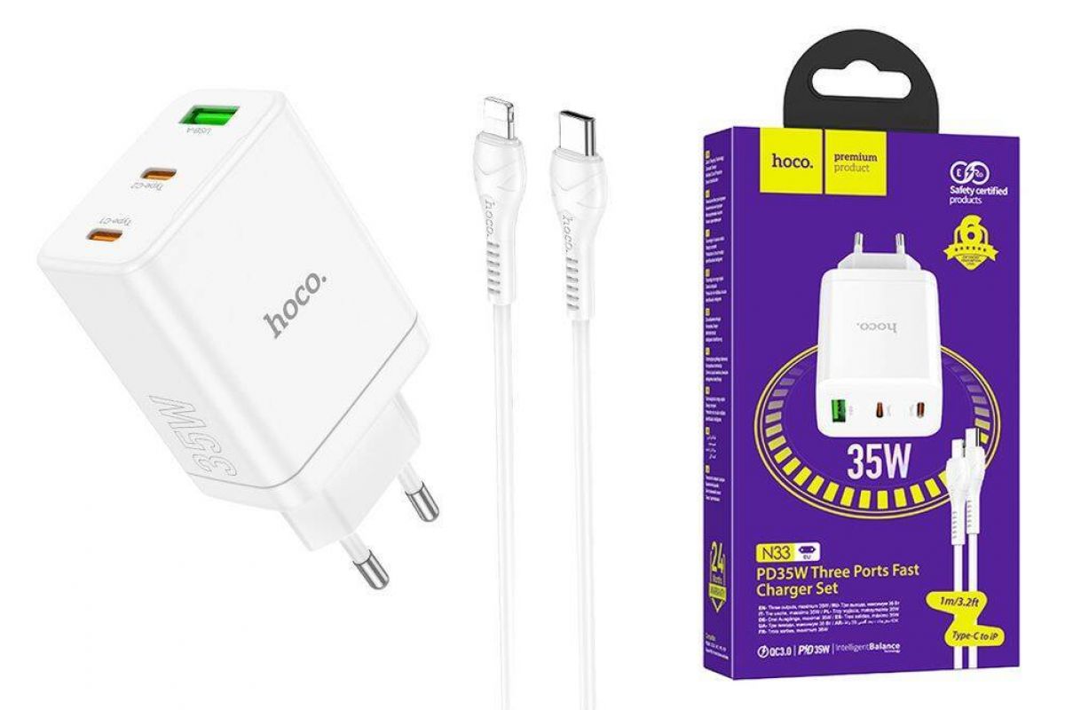 Сетевое зарядное устройство USB+2USB-C + кабель Type-C-Lightning HOCO N33 Powerful PD35W + QC3.0 (белый)