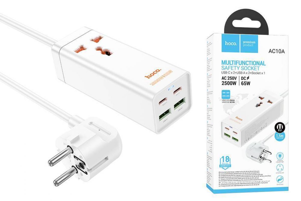 Сетевое зарядное устройство адаптер 2USB + 2USB-C + socket HOCO AC10A Barru PD65W (белый)