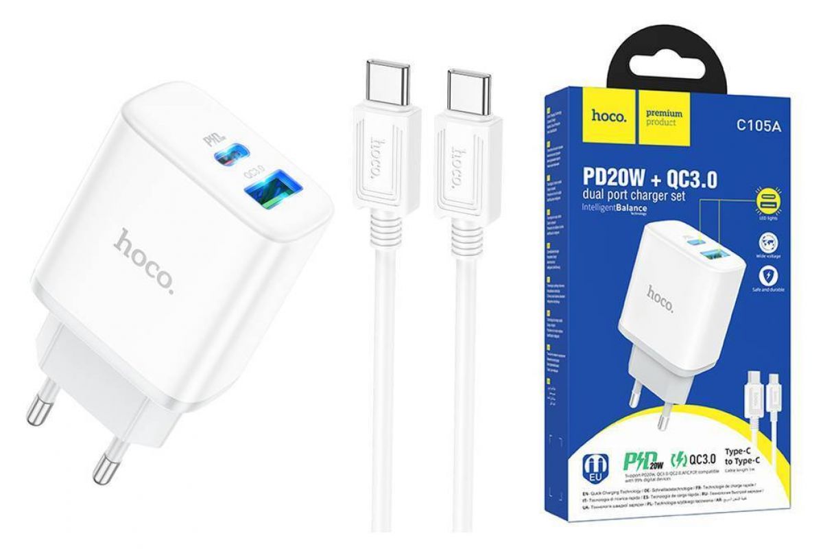 Сетевое зарядное устройство USB+USB-C + кабель Type-C-Type-C HOCO C105A Powerful PD20W + QC3.0 (белый) Сетевое зарядное устройство USB+USB-C + кабель Type-C-Type-C HOCO C105A Powerful PD20W + QC3.0 (белый)