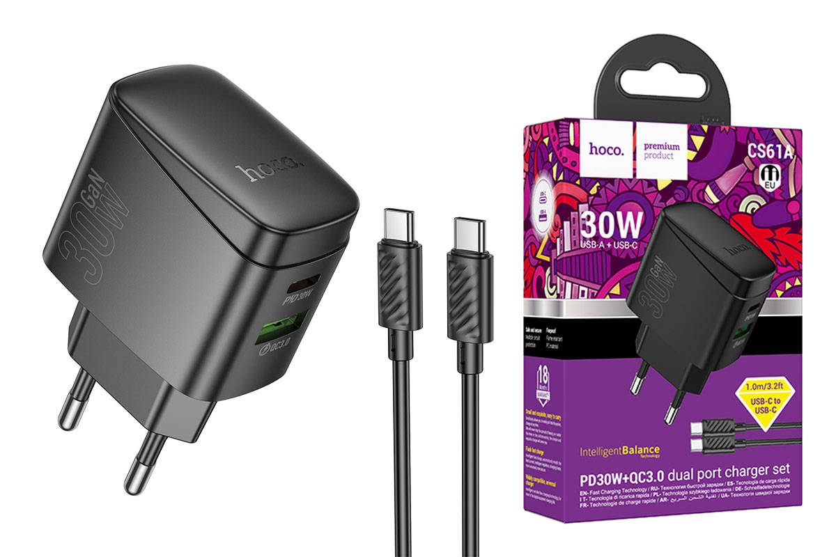 Сетевое зарядное устройство USB + USB-C + кабель Type-C - Type-C HOCO CS61A Bright PD30W+QC3.0 (черный)