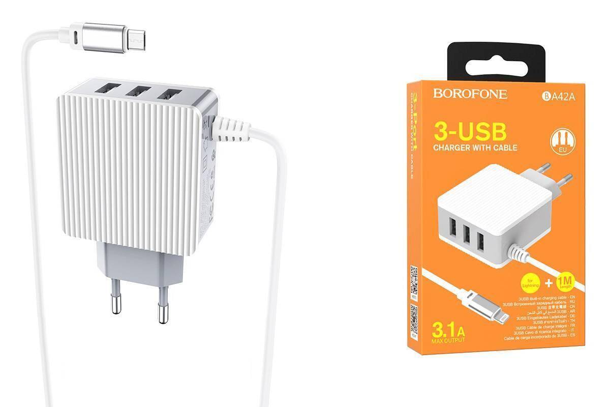 Сетевое зарядное устройство 3USB + кабель MicroUSB BOROFONE BA42A Joyful 2400mAh (белый)