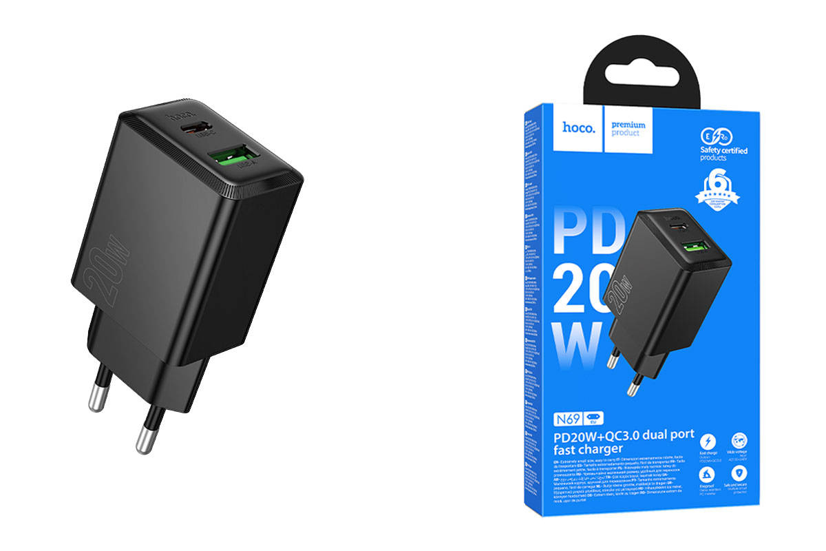 Сетевое зарядное устройство USB + USB-C HOCO N69 Nuevo PD20W+QC3.0 (черный)