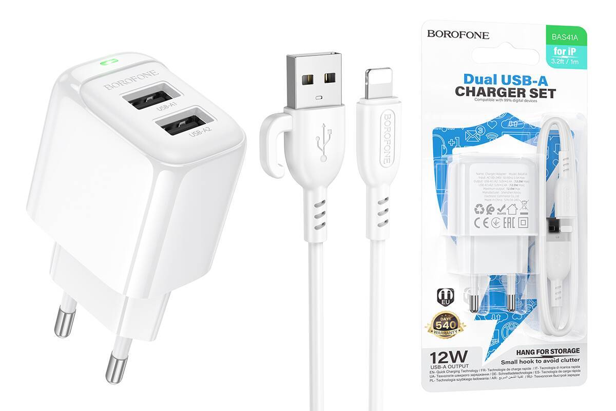Сетевое зарядное устройство 2USB + кабель Lightning BOROFONE BAS41A Potential (белый)