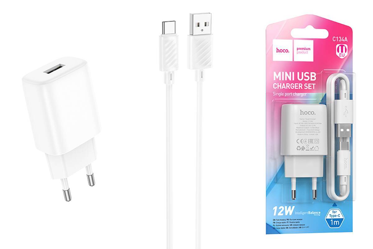 Сетевое зарядное устройство USB + кабель Type-C HOCO C134A Solid (белый)