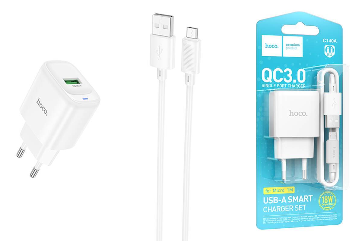 Сетевое зарядное устройство USB + кабель MicroUSB HOCO C140A Smart QC3.0 (белый)