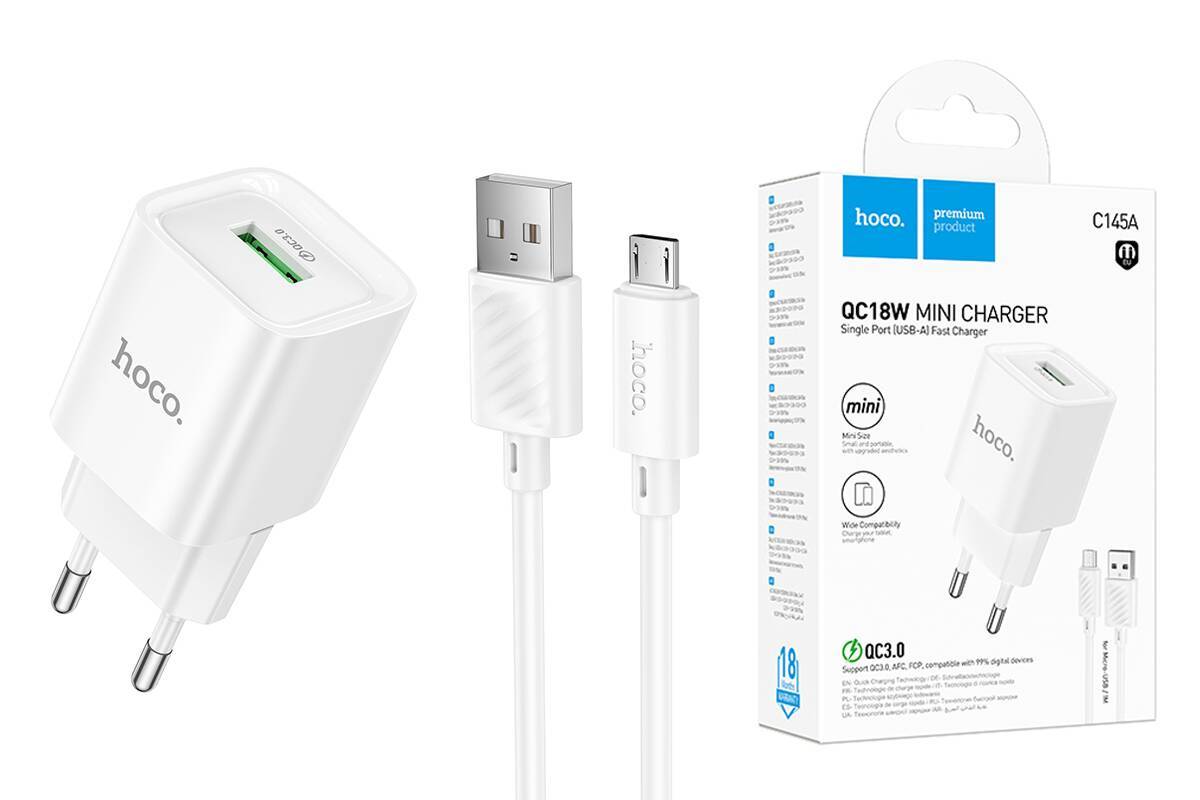 Сетевое зарядное устройство USB + кабель MicroUSB HOCO C145A Charm QC3.0 (белый)