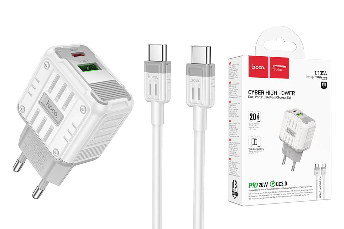 Сетевое зарядное устройство USB+USB-C + кабель Type-C-Type-C HOCO C135A Rock PD20W+QC3.0 (белый)