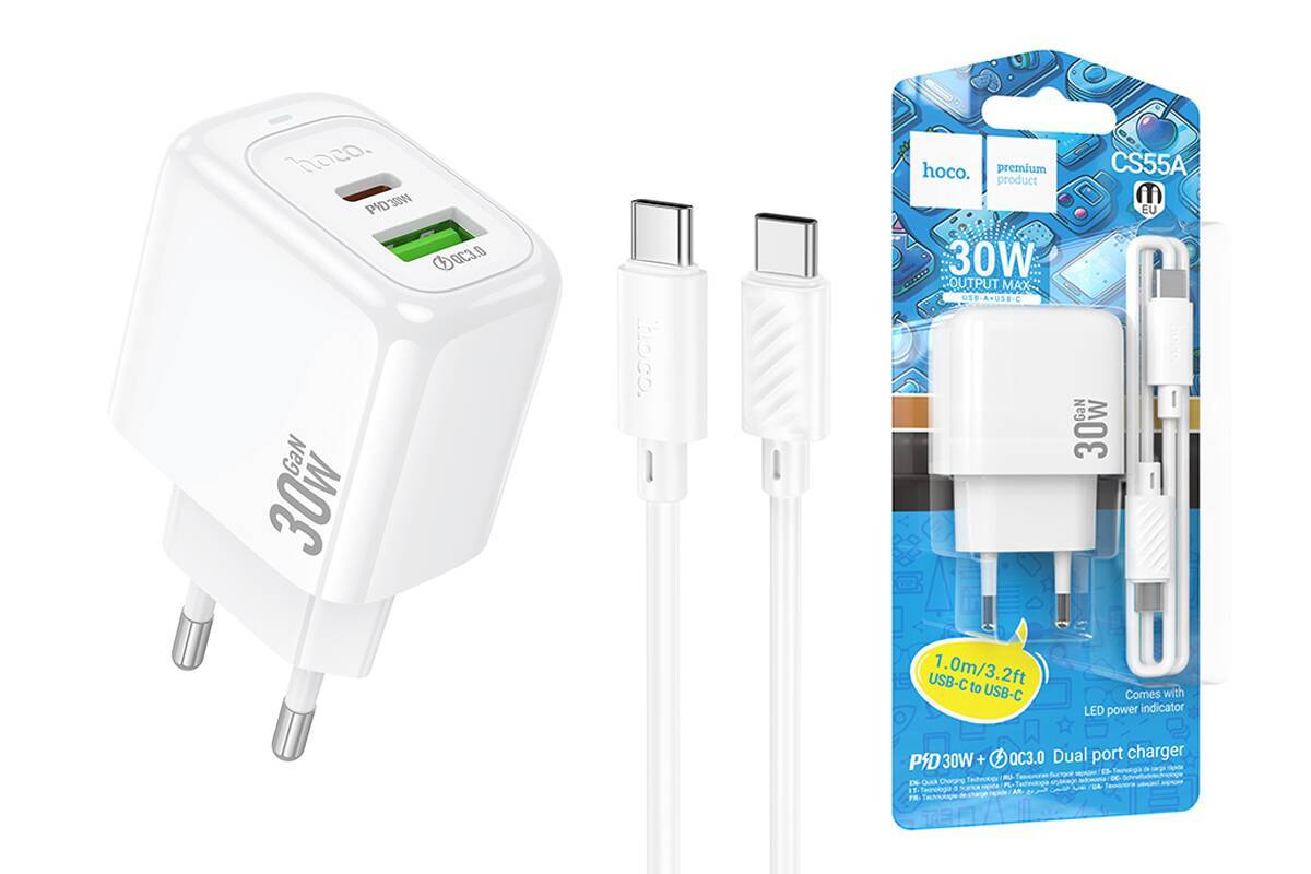Сетевое зарядное устройство USB + USB-C + кабель Type-C HOCO CS55A Surplus PD30W+QC3.0 (белый)