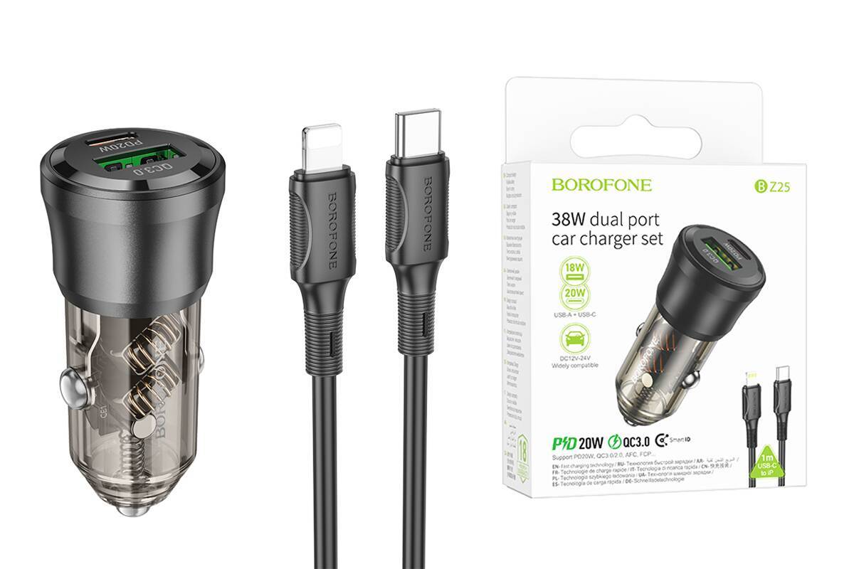Автомобильное зарядное устройство АЗУ USB-C + кабель Lightning BOROFONE BZ24 PD20W (черный прозрачный)