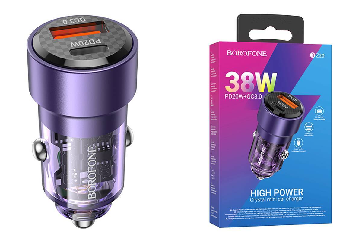 Автомобильное зарядное устройство АЗУ USB + USB-C BOROFONE BZ20 38W PD20W + QC3.0 (фиолетовый прозрачный)