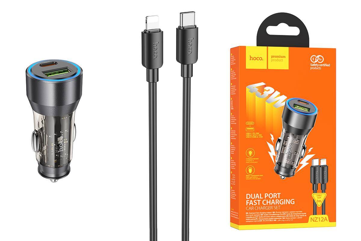 Автомобильное зарядное устройство АЗУ USB + USB-C + кабель Lightning HOCO NZ12A Action PD43W+QC3.0 (черный прозрачный)