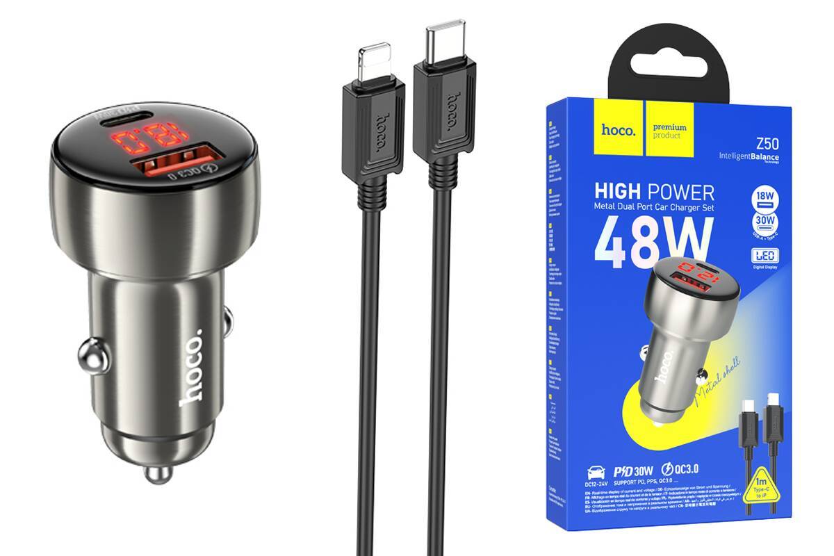 Автомобильное зарядное устройство АЗУ USB + USB-C + кабель Lightning HOCO Z50 Leader PD30W + QC3.0 (серый)