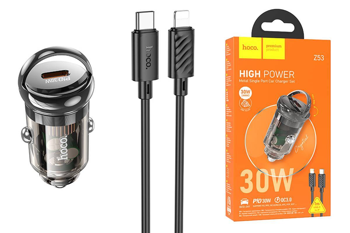 Автомобильное зарядное устройство АЗУ USB-C + кабель Lightning HOCO Z53 PD30W (черный прозрачный)