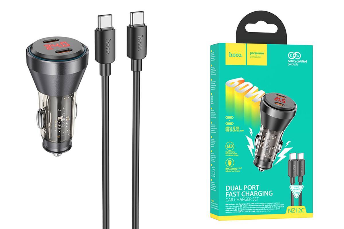 Автомобильное зарядное устройство АЗУ 2USB-С + кабель Type-C HOCO NZ12C 60W (черный прозрачный)
