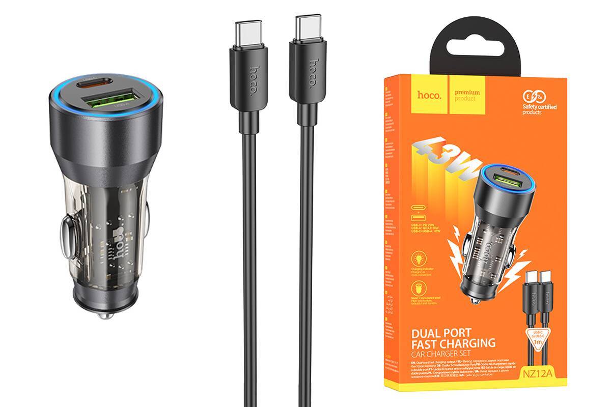 Автомобильное зарядное устройство АЗУ USB + USB-С + кабель Type-C HOCO NZ12A PD43W (черный прозрачный)