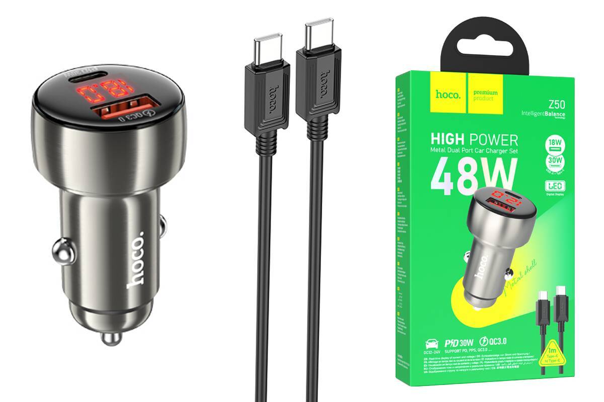 Автомобильное зарядное устройство АЗУ USB + USB-С + кабель Type-C HOCO Z50 48W PD30W+QC3.0 (серый)