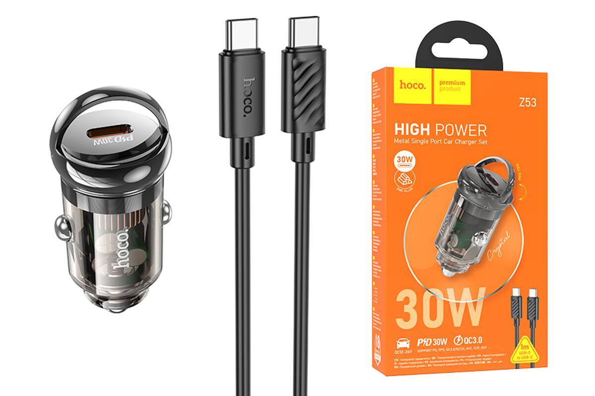 Автомобильное зарядное устройство АЗУ USB-С + кабель Type-C HOCO Z53 PD30W (черный прозрачный)