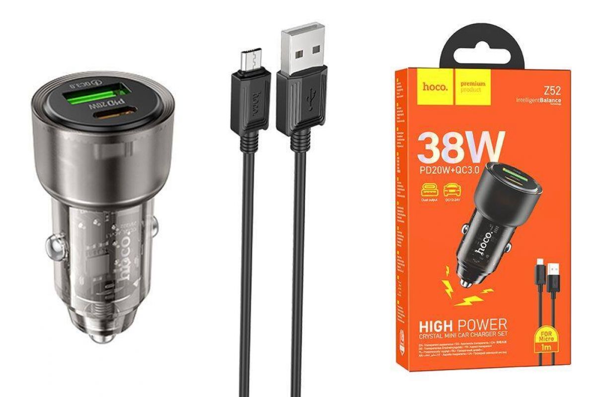 Автомобильное зарядное устройство АЗУ USB + USB-C + кабель MicroUSB HOCO Z52 Spacious PD38W (черный прозрачный)